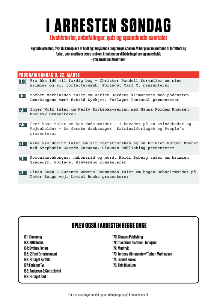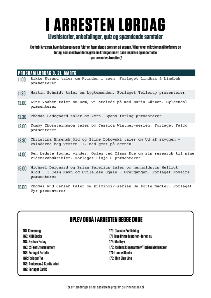 Kig forbi Arresten på Krimimessen. Her kan du traditionen tro møde en række spændende forlag med masser af gode tilbud, signeringer og meget mere i vaskeægte fængselsceller. Du kan også opleve et fuldt og fængslende program på scenen i Arresten. Vi har nemlig givet mikrofonen til forfattere og forlag, som med hver deres greb om krimigenren vil både inspirere og underholde.